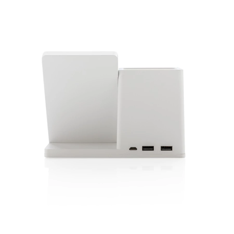 10W fast wireless charger with pen holder made with RCS (Recycled Claim Standard) certified recycled ABS. Total recycled content: 78% based on total item weight. RCS certification ensures a completely certified supply chain of the recycled materials. Bamboo wireless charging area made from FSC 100 bamboo. With two USB ports on the back to charge via cable. Wireless charging compatible with Android latest generations, iPhone 8 and up. Item and accessories PVC free. Including 120 cm type C charging cable made from RCS certified recycled TPE. Packed in FSC mix kraft box. Type-C Input 5V/2A; 9V/2A; Wireless output 5V/1A;9V/1.1A; (10W) Registered design®