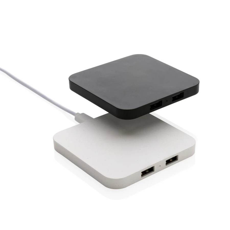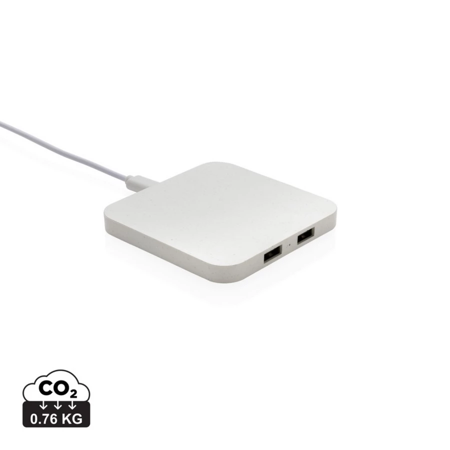 10W wireless fast charger with two USB ports made with RCS (Recycled Claim Standard) certified recycled ABS. Total recycled content: 57% based on total item weight. RCS certification ensures a completely certified supply chain of the recycled materia