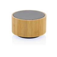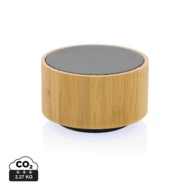 3W wireless speaker made with FSC® 100% bamboo casing and RCS (Recycled Claim Standard) certified recycled ABS. Total recycled content: 16% based on total item weight. RCS certification ensures a completely certified supply chain of the recycled materials. The speaker has an integrated light at the bottom. The speaker is equipped with a 300 mAh battery to ensure up to 3 hours of playing time and BT4.1 for smooth connection and clear sound. Connection range up to 10 metres. With mic to answer calls. Packed in FSC mix FSC® box. Including RCS certified recycled TPE charging cable. Item and accessories 100% PVC free.