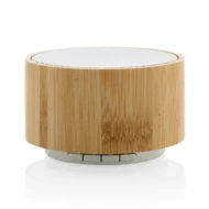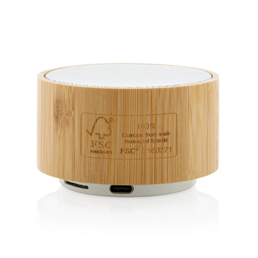 3W wireless speaker made with FSC® 100% bamboo casing and RCS (Recycled Claim Standard) certified recycled ABS. Total recycled content: 16% based on total item weight. RCS certification ensures a completely certified supply chain of the recycled materials. The speaker has an integrated light at the bottom. The speaker is equipped with a 300 mAh battery to ensure up to 3 hours of playing time and BT4.1 for smooth connection and clear sound. Connection range up to 10 metres. With mic to answer calls. Packed in FSC mix FSC® box. Including RCS certified recycled TPE charging cable. Item and accessories 100% PVC free.