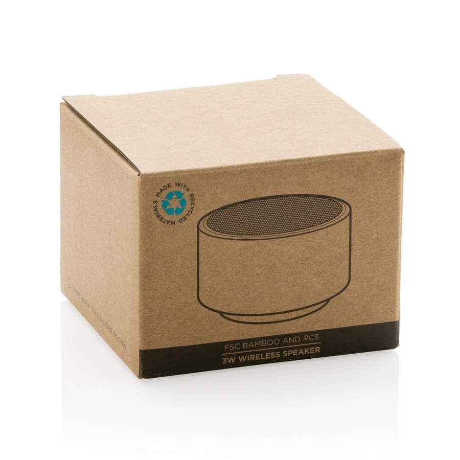 3W wireless speaker made with FSC® 100% bamboo casing and RCS (Recycled Claim Standard) certified recycled ABS. Total recycled content: 16% based on total item weight. RCS certification ensures a completely certified supply chain of the recycled mat