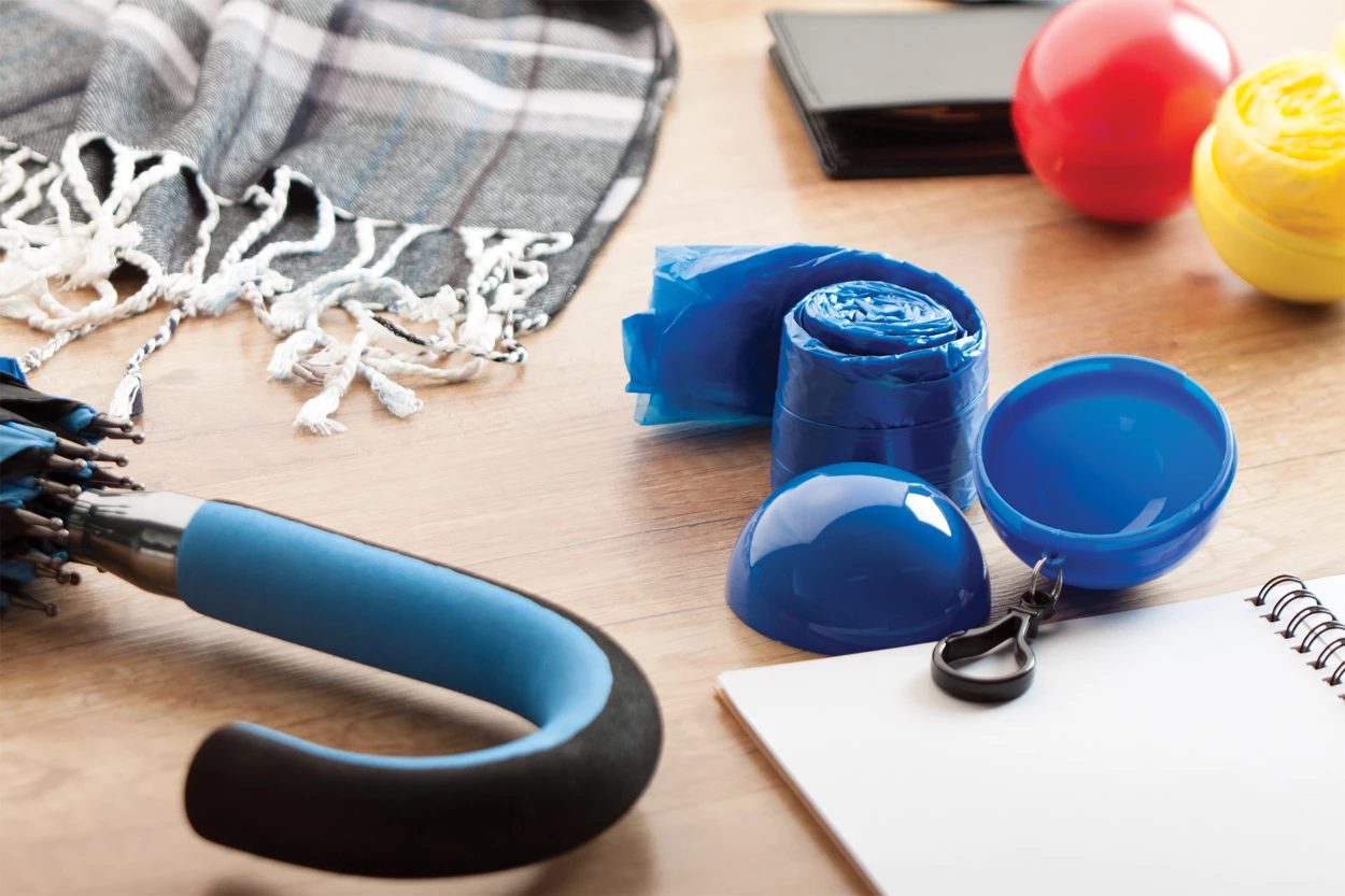 Regenponcho, gefaltet in rundem Schlüsselanhänger mit Karabiner.