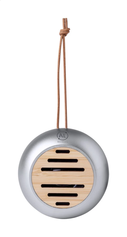 Kabelloser Lautsprecher aus recyceltem Aluminium mit Bambusnetz und PU-Leder-Trageriemen. Mit eingebautem, wiederaufladbarem Akku. Inklusive USB-Ladekabel.