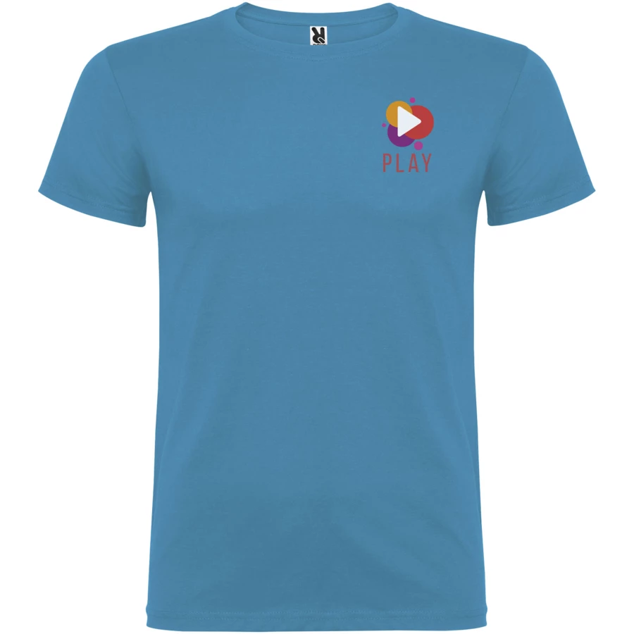Kurzärmeliges T-Shirt mit doppellagigem Rundhalsausschnitt aus Elasthan, hergestellt aus schlauchförmigem Material für Erwachsene. Verstärkte und verdeckte Nähte am Kragen. Herausnehmbares Etikett. Das Modell ist 190 cm groß und trägt Größe L.
