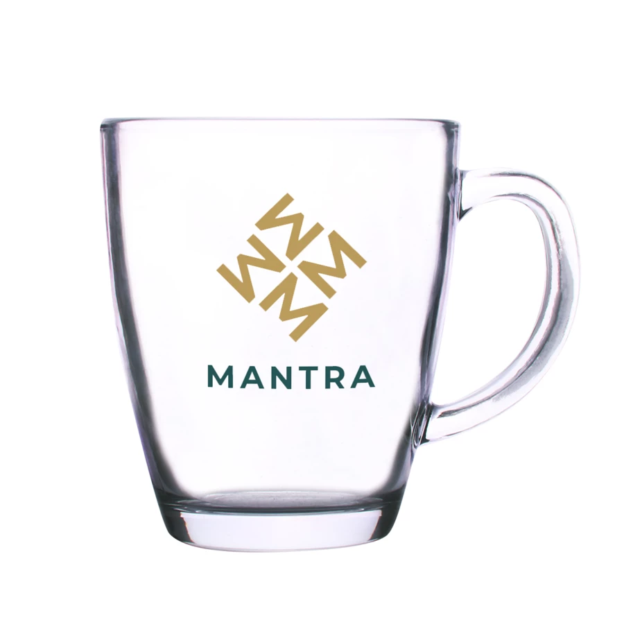 Ein Glasbecher mit konvexer Form und ergonomischem Griff. Er ist aus dickem Glas gefertigt und hat einen stabilen Boden.