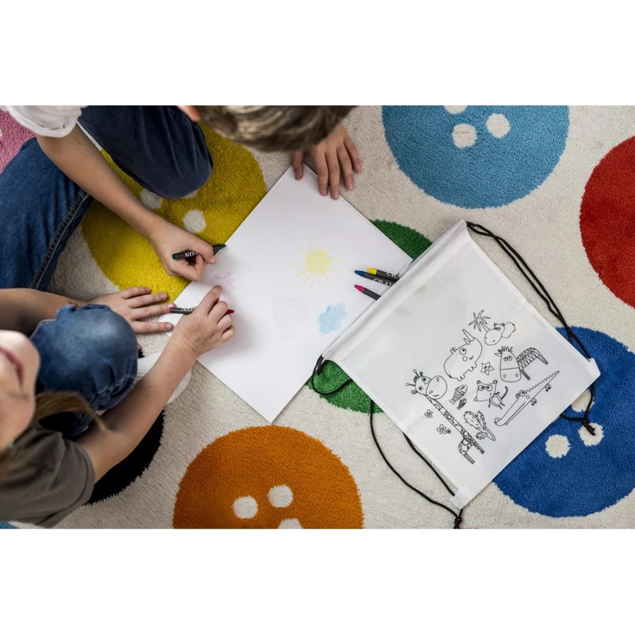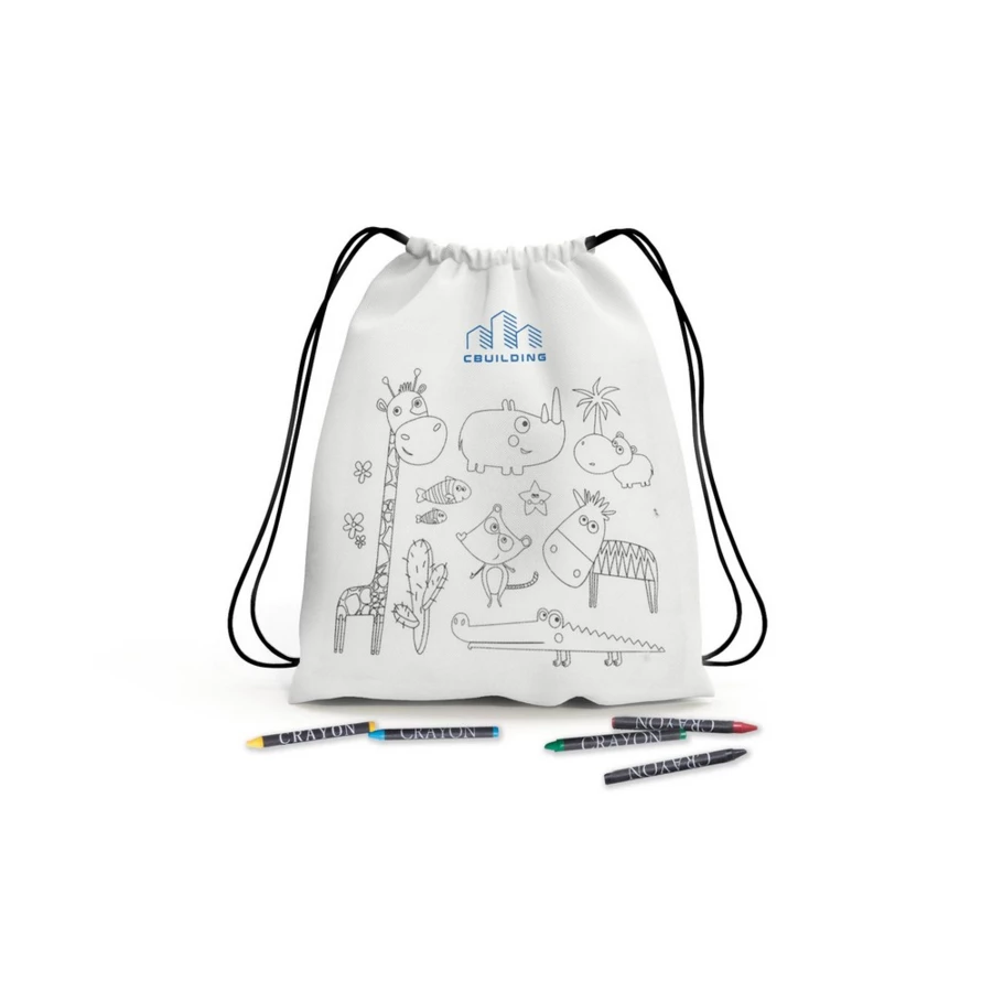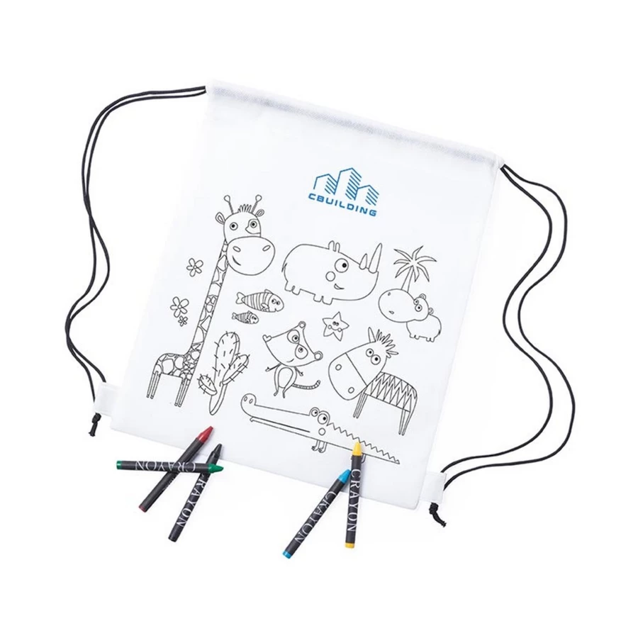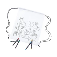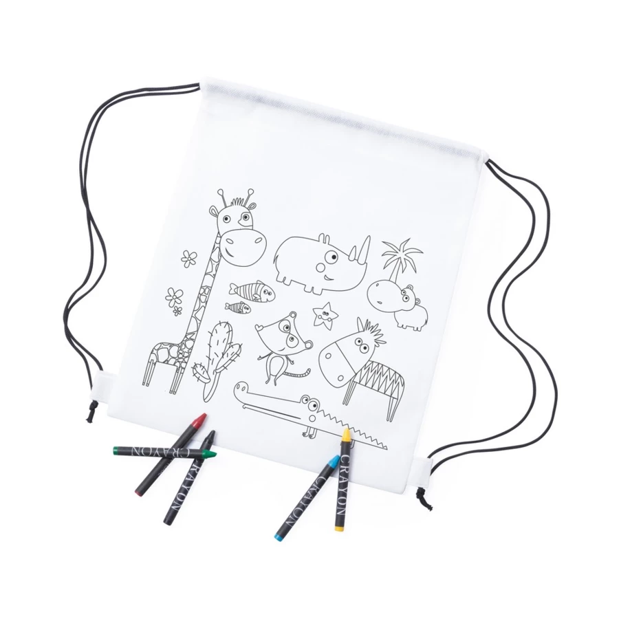 Beutel mit Kordelzug zum Tragen auf dem Rücken, Malbuch mit Tiermotiv auf der Vorderseite, 5 Kerzenstifte enthalten, Produkt aus Non Woven Material 80 g/m2