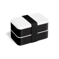 Frischhaltebox aus PP und PS mit 2 Fächer (je 680 mL) und einer herausnehmbarer Trennwand. Enthält Gabel, Messer und Löffel. Schließung mittels Gummiband. Für Mikrowellengebrauch den Deckel abnehmen. 180 x 100 x 100 mm