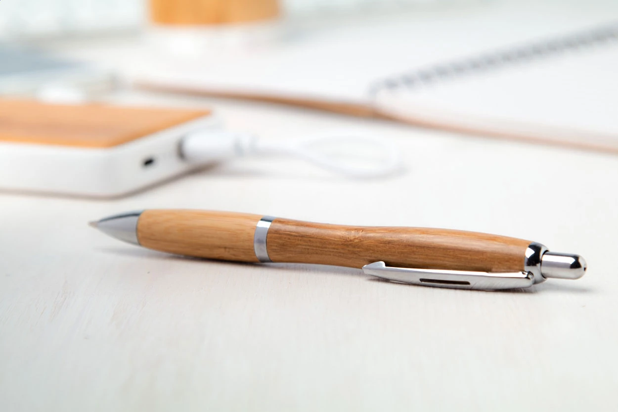 Bambus-Kugelschreiber mit Metallclip, blauschreibend.