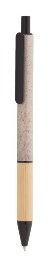 Kugelschreiber aus ökologischem Weizenstrohkunststoff mit Bambus-Griffzone und farbigen Elementen, blauschreibend.