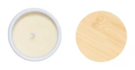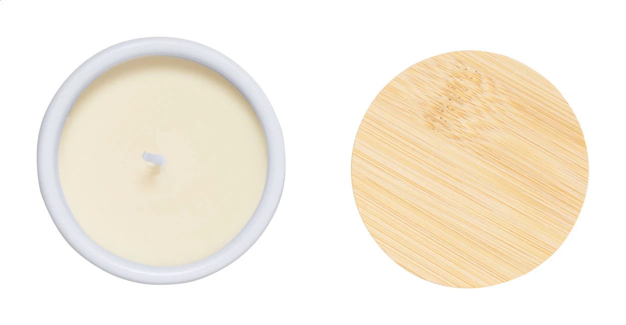 Pflanzliche Wachskerze mit Vanilleduft in einem Keramikhalter mit Naturkorkboden und Bambusdeckel.
