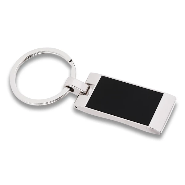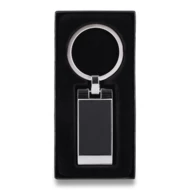 Gustowny metalowy brelok łączący czarną matową powierzchnię z błyszczącymi elementami. Pakowany w czarne pudełko upominkowe.