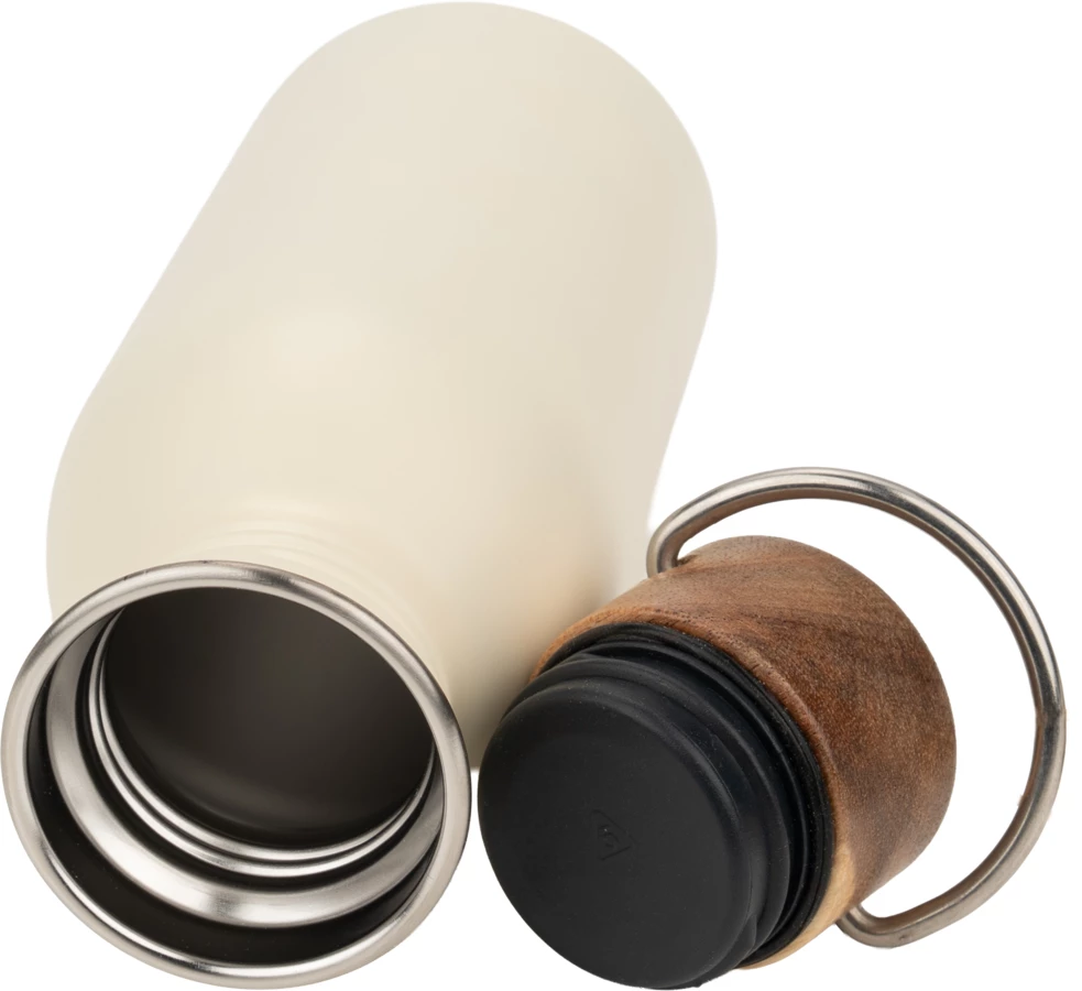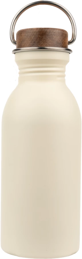 Butelka do picia, wykonana ze stali nierdzewnej z recyklingu, zamykana na zakrętkę z drewna akacjowego, wyposażona w uchwyt do przenoszenia. Pojemność 500 ml.