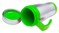Doppelwandiger Isolierbecher aus Edelstahl mit farbigen Kunststoffteilen. Füllmenge: 450 ml. Einzeln in Geschenkbox.