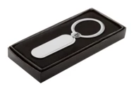 Metall-Schlüsselanhänger in Kapselform. Einzeln in schwarzer Geschenkbox.