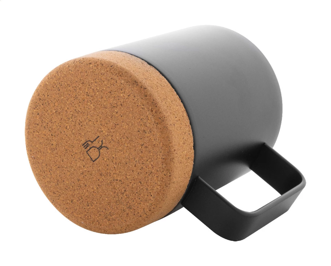 Doppelwandiger Thermobecher aus Edelstahl mit Trinkdeckel und Fuß aus natürlichem Kork, einzeln in Kraftpapierbox. Füllmenge: 330 ml.