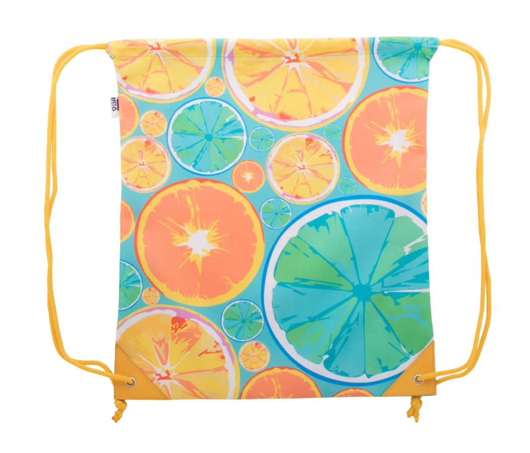 Individueller Turnbeutel aus 600D RPET Polyester mit verstärkten Ecken aus Kunstleder und dicken, farblich abgestimmten Kordeln. Inklusive vollflächigem Sublimationsdruck und RPET-Label. Mindestmenge: 25 Stk.