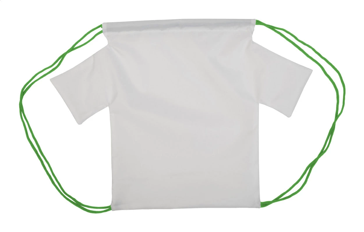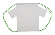Individuelles Turnbeutel in T-Shirt-Form für Kinder mit farbigen Kordeln, Material: 190T Polyester. Der Preis ist inkl. vollflächigem Sublimationsdruck. Mindestmenge: 25 Stk.