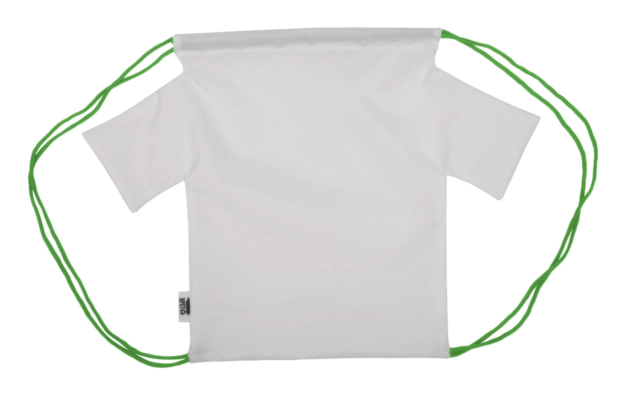 Individueller Turnbeutel in T-Shirt-Design mit farbigen Zugkordeln und vollflächigem Sublimationsdruck. Material: 190T RPET Polyester. Mindestmenge: 25 Stk.