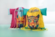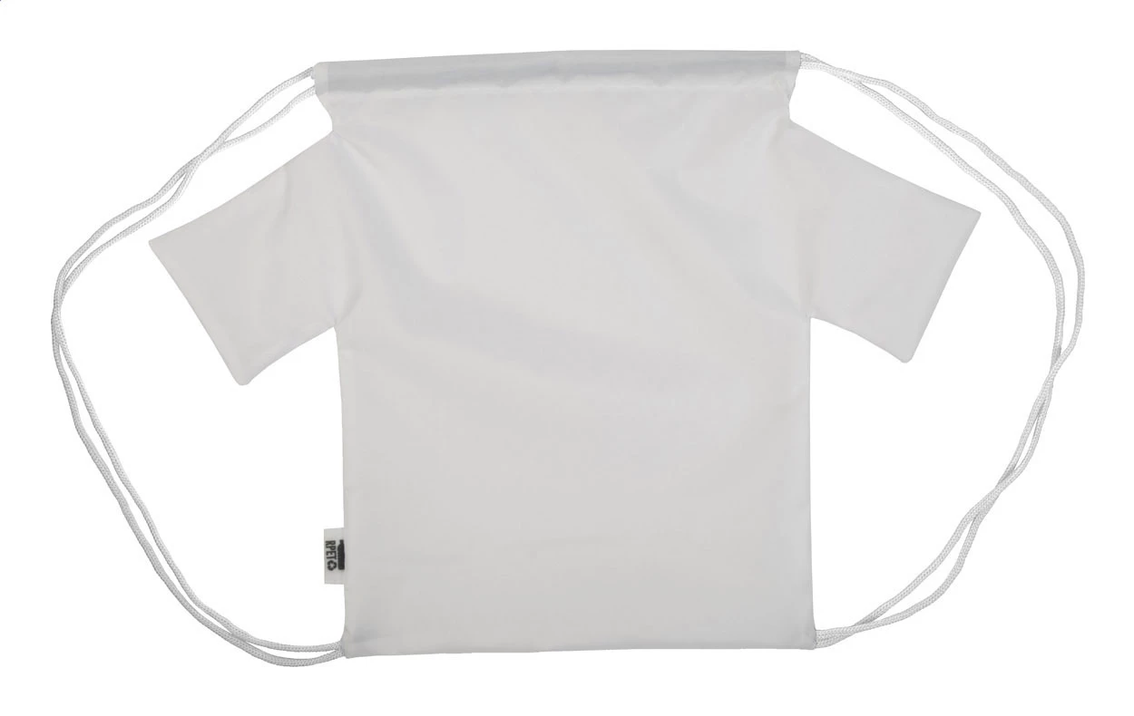 Individueller Turnbeutel in T-Shirt-Design mit farbigen Zugkordeln und vollflächigem Sublimationsdruck. Material: 190T RPET Polyester. Mindestmenge: 25 Stk.