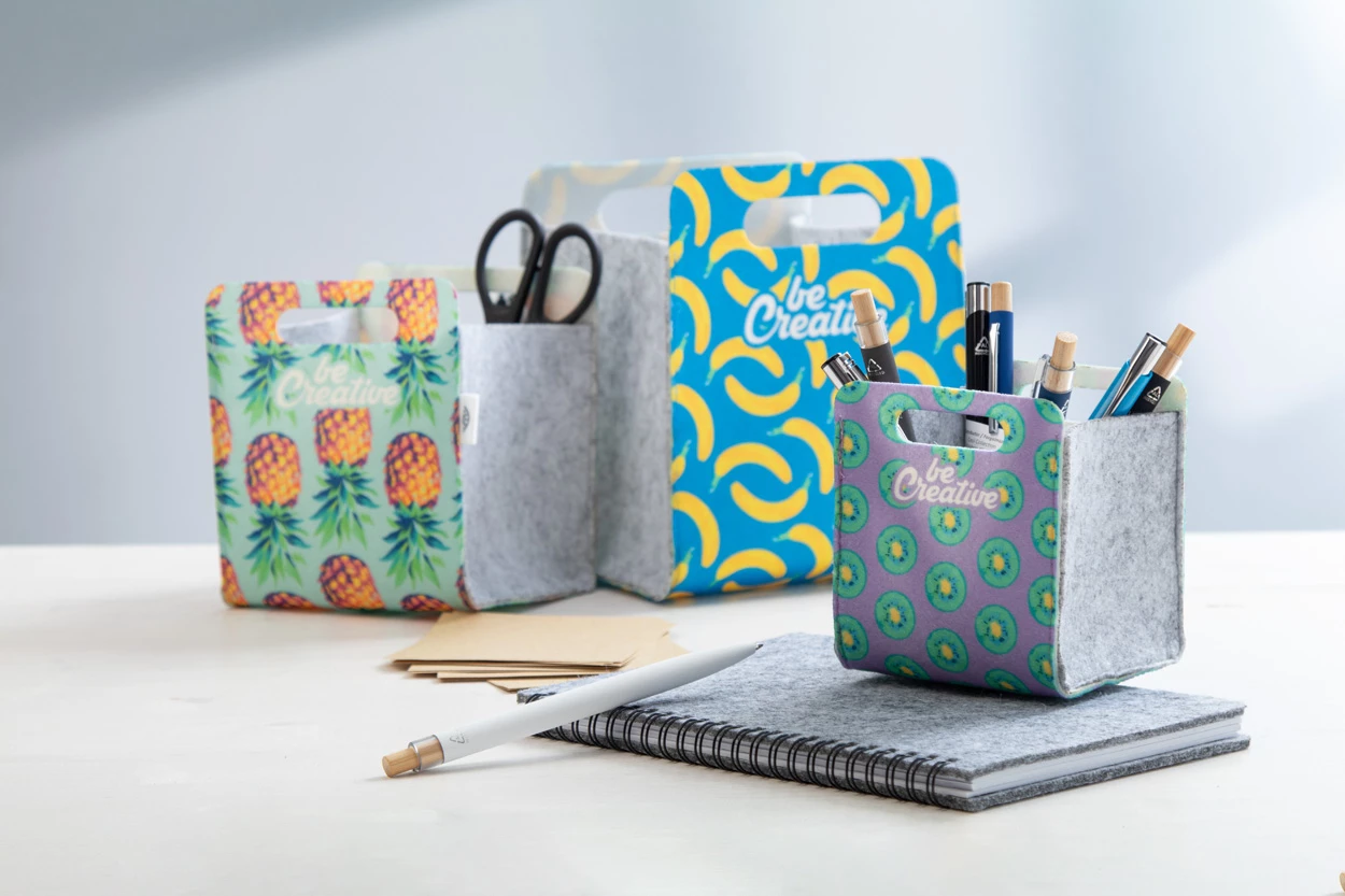 Individueller Schreibtisch-Organizer-Korb aus RPET-Filz mit Vollfarbdruck. Mit gestanzten Griffen und RPET-Etikett. Der Preis beinhaltet den Sublimationsdruck. Mindestbestellmenge: 50 Stück.