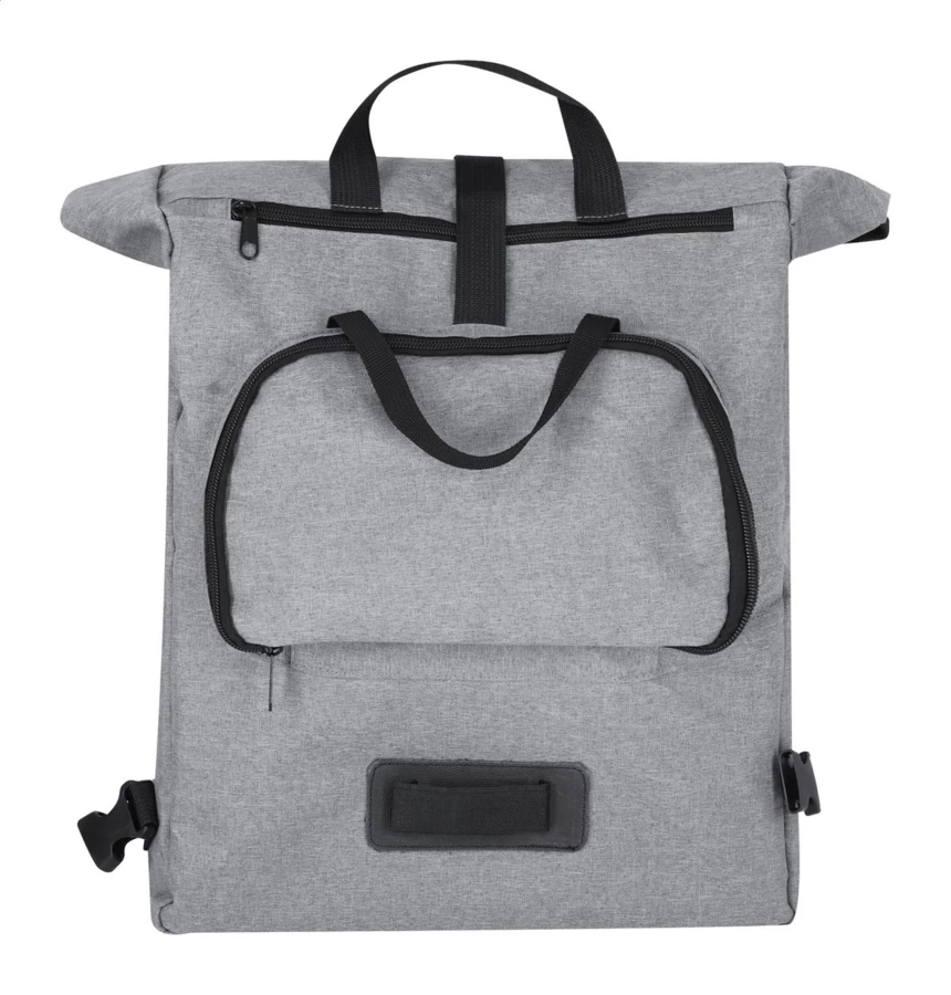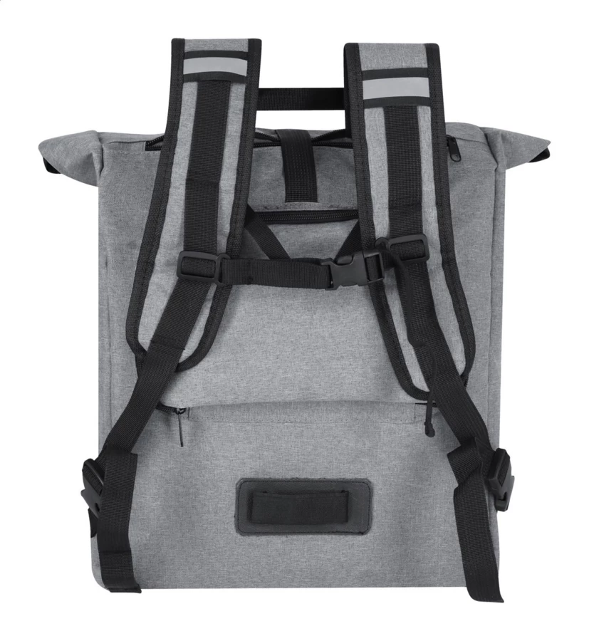 Fahrradrucksack aus 600D RPET-Polyester mit Reißverschlusstasche auf der Vorderseite und abnehmbaren gepolsterten Schultergurten. Mit versteckten Rahmenbefestigungsklammern.
