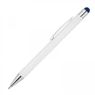 Aluminiowy długopis z powłoką soft touch i srebrnymi elementami, kolorową końcówką do obsługi ekranów dotykowych oraz wkładem piszącym na niebiesko.