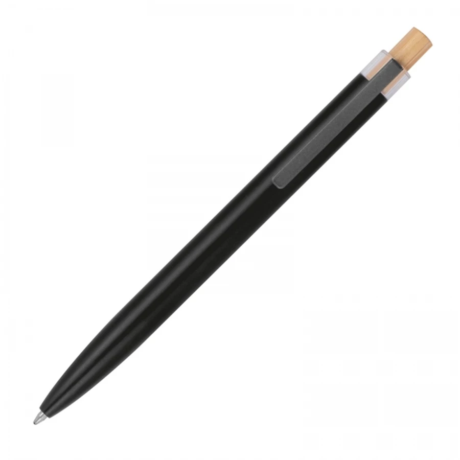 Długopis wykonany z aluminium pochodzącego z recyklingu, z niebieskim wkładem i bambusowym przyciskiem. Długopis wykonano z solidnego materiału, a dzięki odpowiedniemu ciężarowi, jest wyjątkowo wytrzymały i dobrze wyważony w dłoni. Powłoka długopisu gładka w dotyku, matowa.