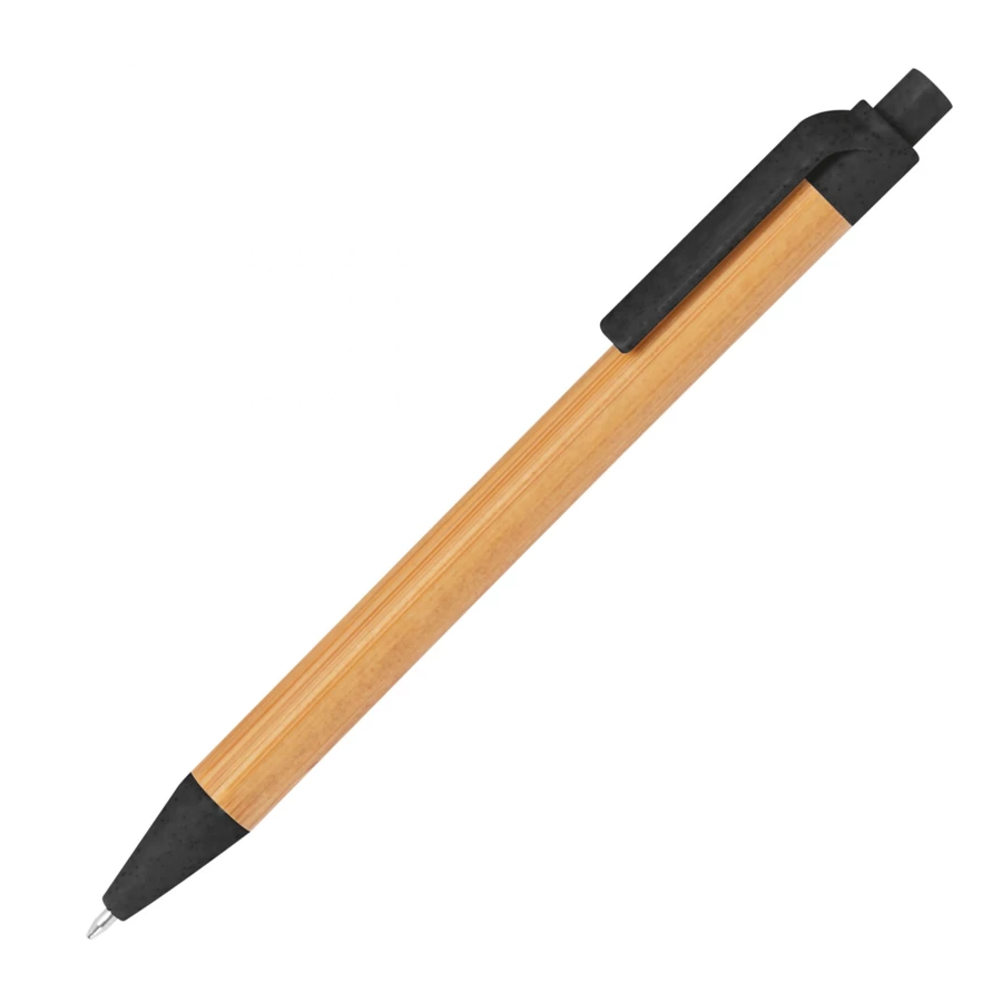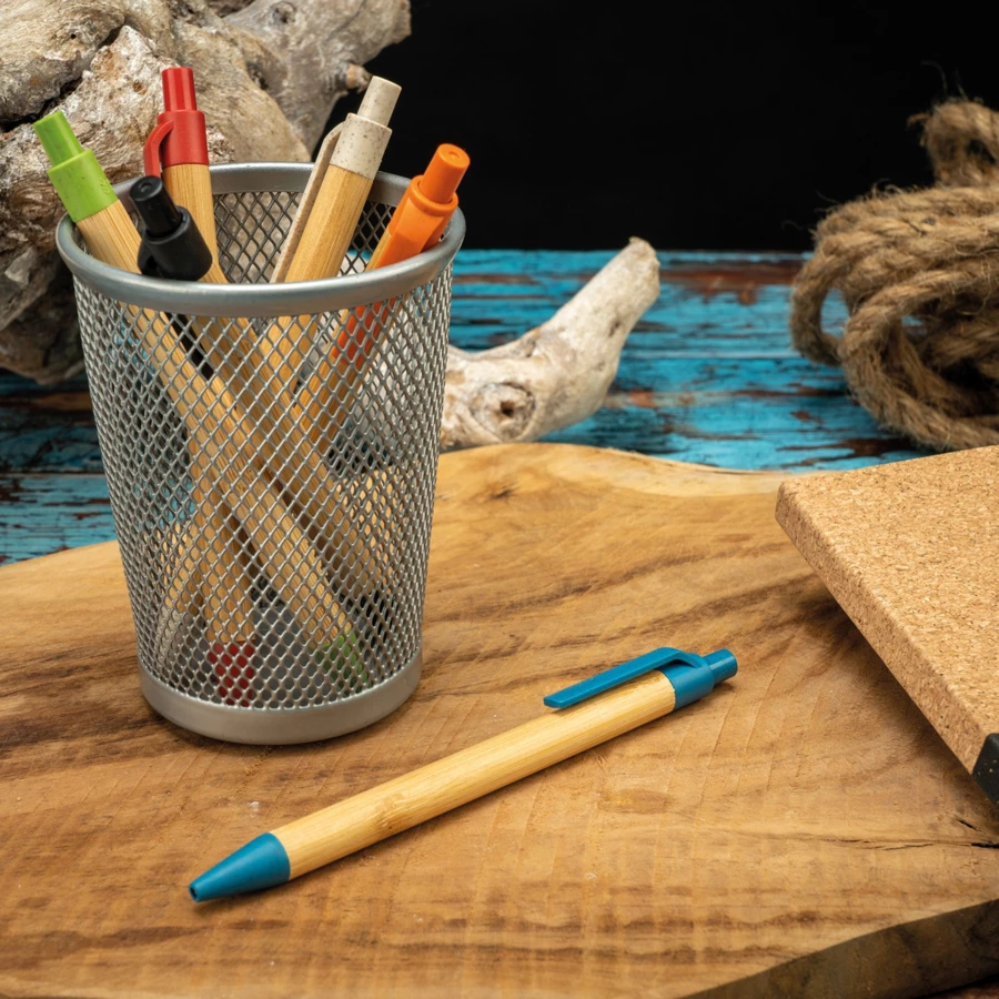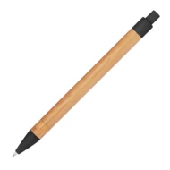 Długopis wykonany z bambusa z kolorowymi elementami wykonanymi z włókna pszenicznego. Posiada klikany mechanizm i wkład w kolorze niebieskim.
