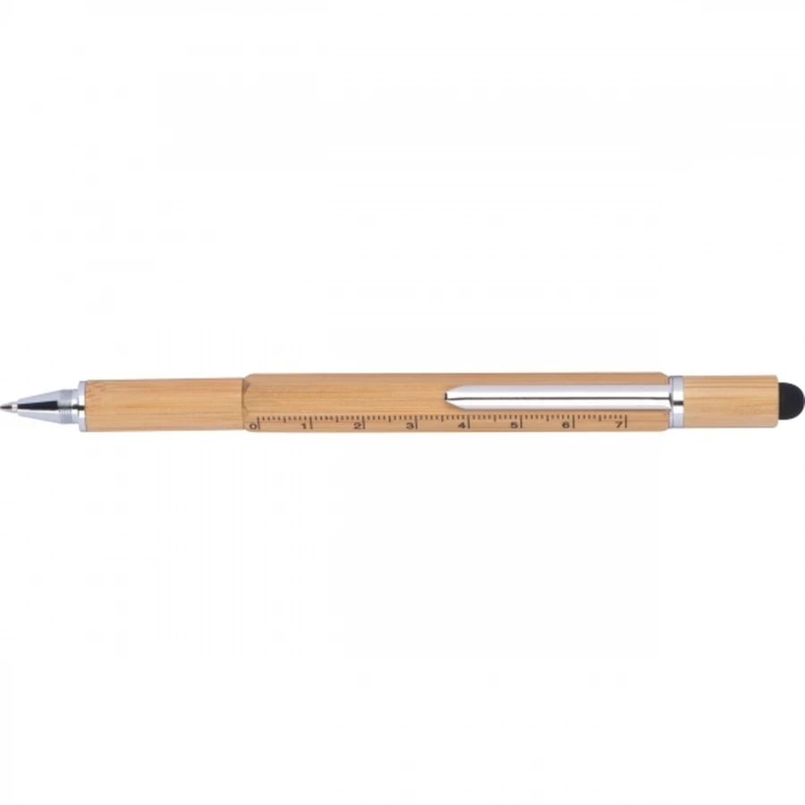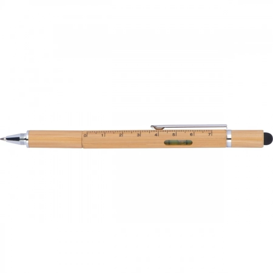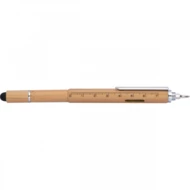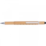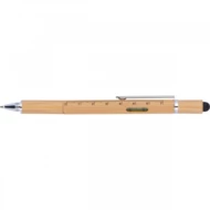 Praktyczny wielofunkcyjny długopis 6w1 wykonany z bambusa z następującymi cechami: przekręcany długopis z czarnym wkładem systemowym, linijka, poziomica, śrubokręt płaski i krzyżakowy oraz pióro dotykowe.