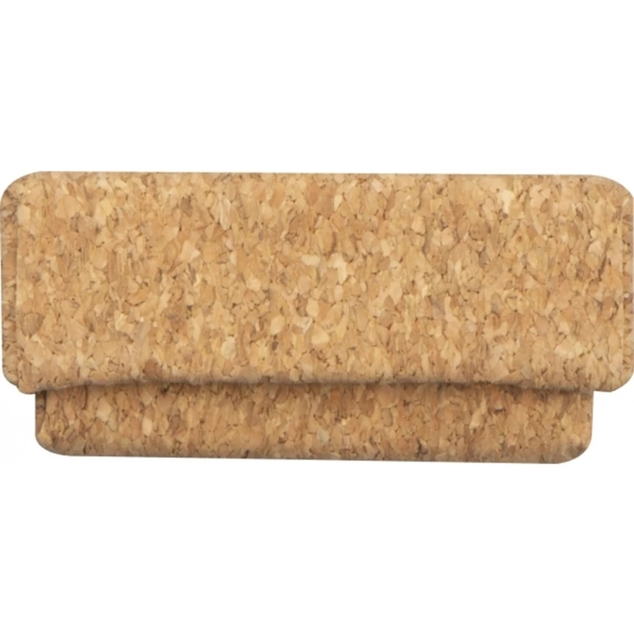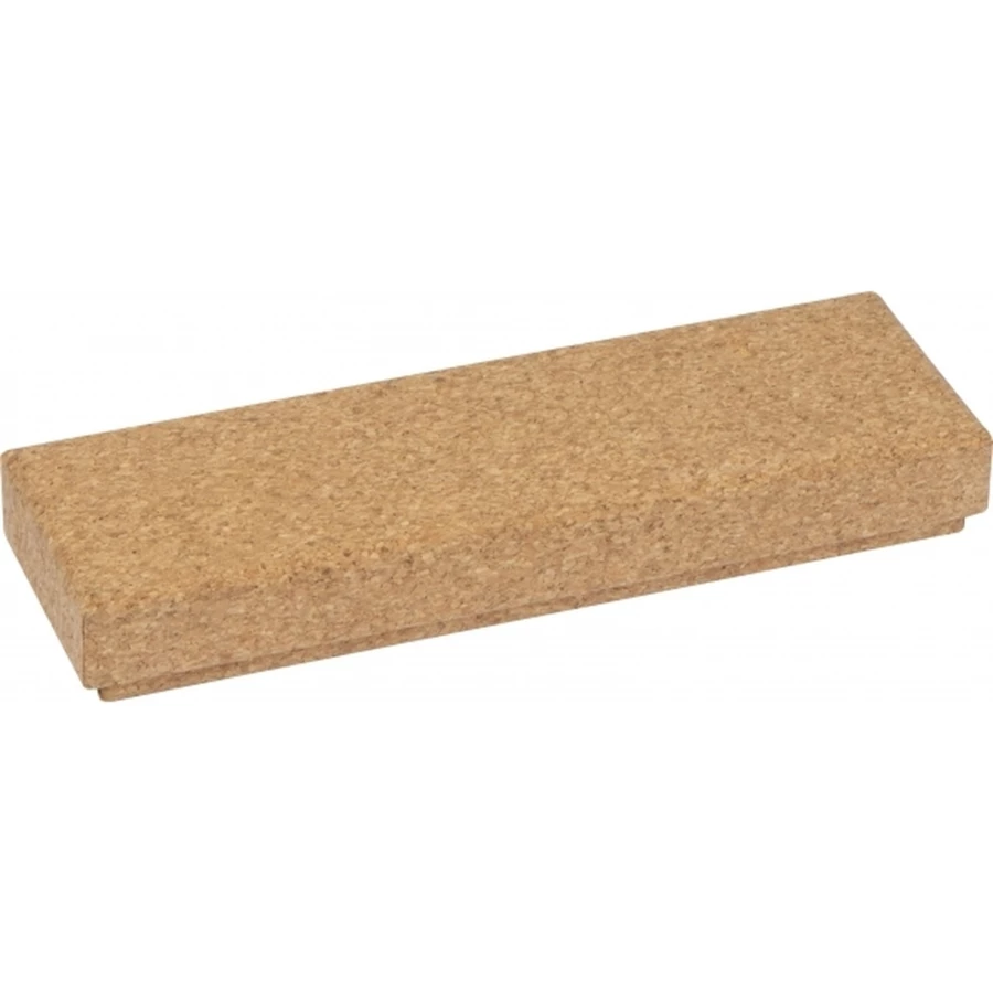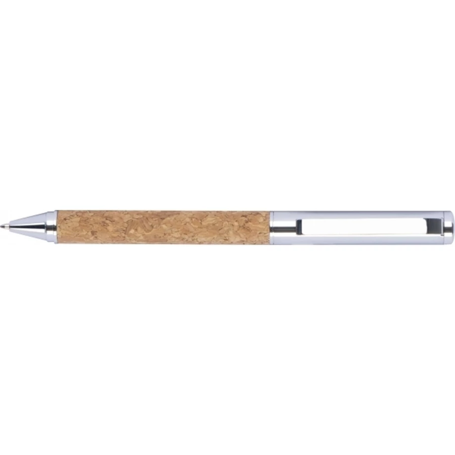 Elegancki długopis wykonany z korka z metalowymi elementami. Długopis posiada niebieski wkład, zapakowany jest w korkowe etui.