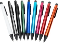 Metalowy długopis z piszącym na niebiesko wkładem o dużej pojemności i ze zdobieniem na korpusie.