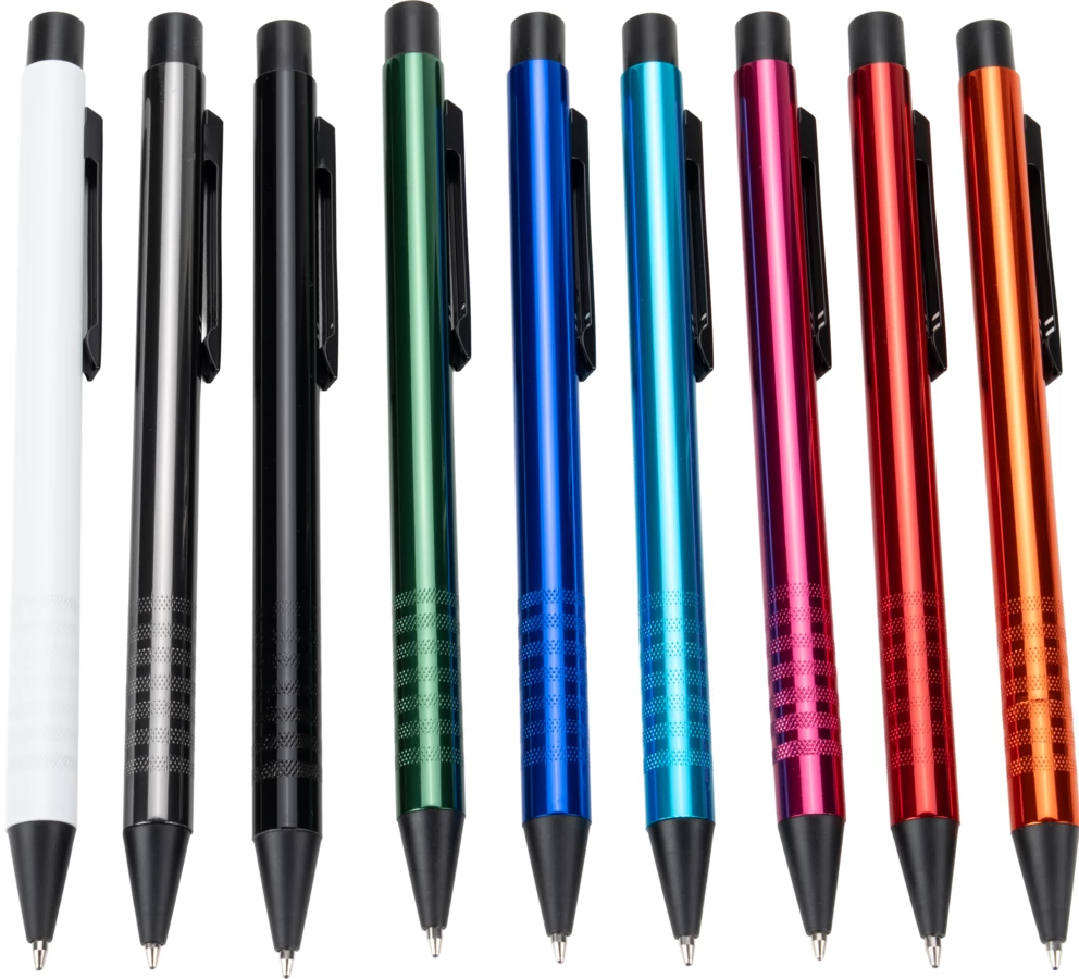 Metalowy długopis z piszącym na niebiesko wkładem o dużej pojemności i ze zdobieniem na korpusie.