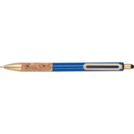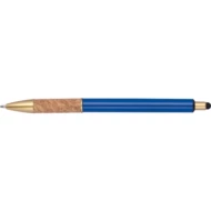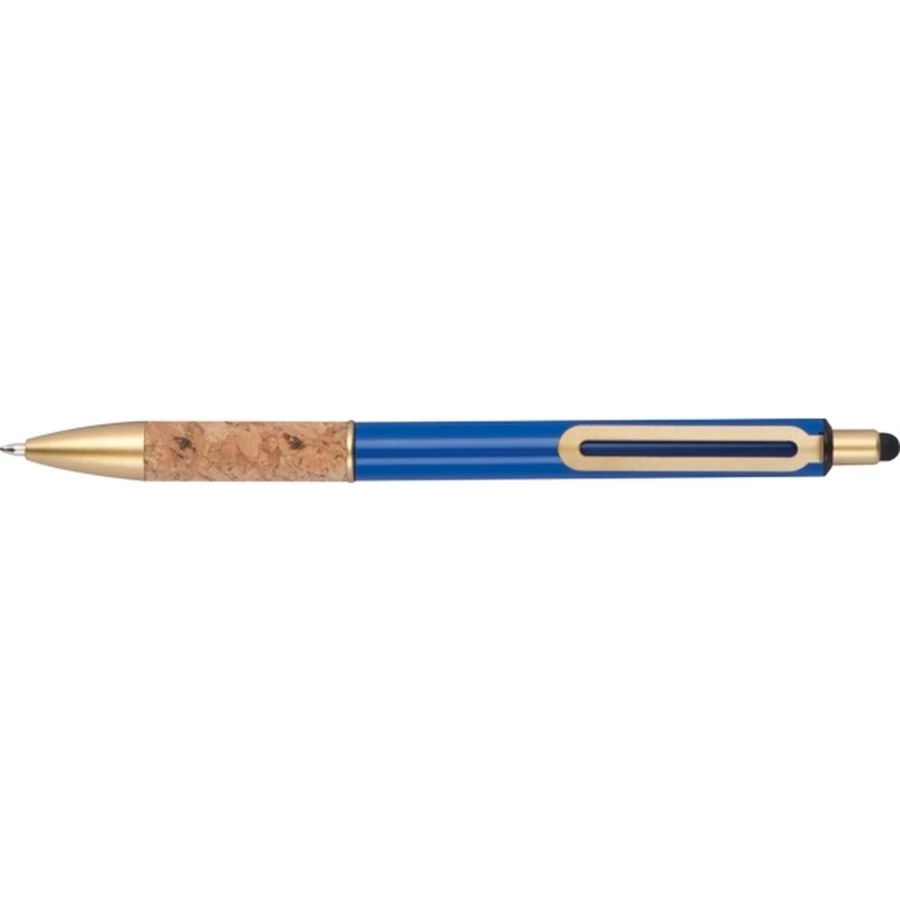 Metalowy długopis ze złotymi elementami i korkową strefą uchwytu. Długopis pisze na niebiesko.