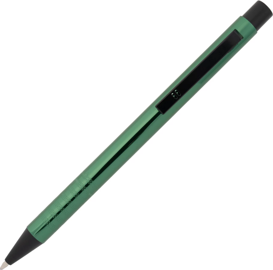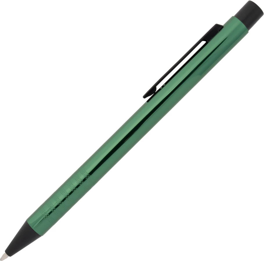Metalowy długopis z piszącym na niebiesko wkładem o dużej pojemności i ze zdobieniem na korpusie.