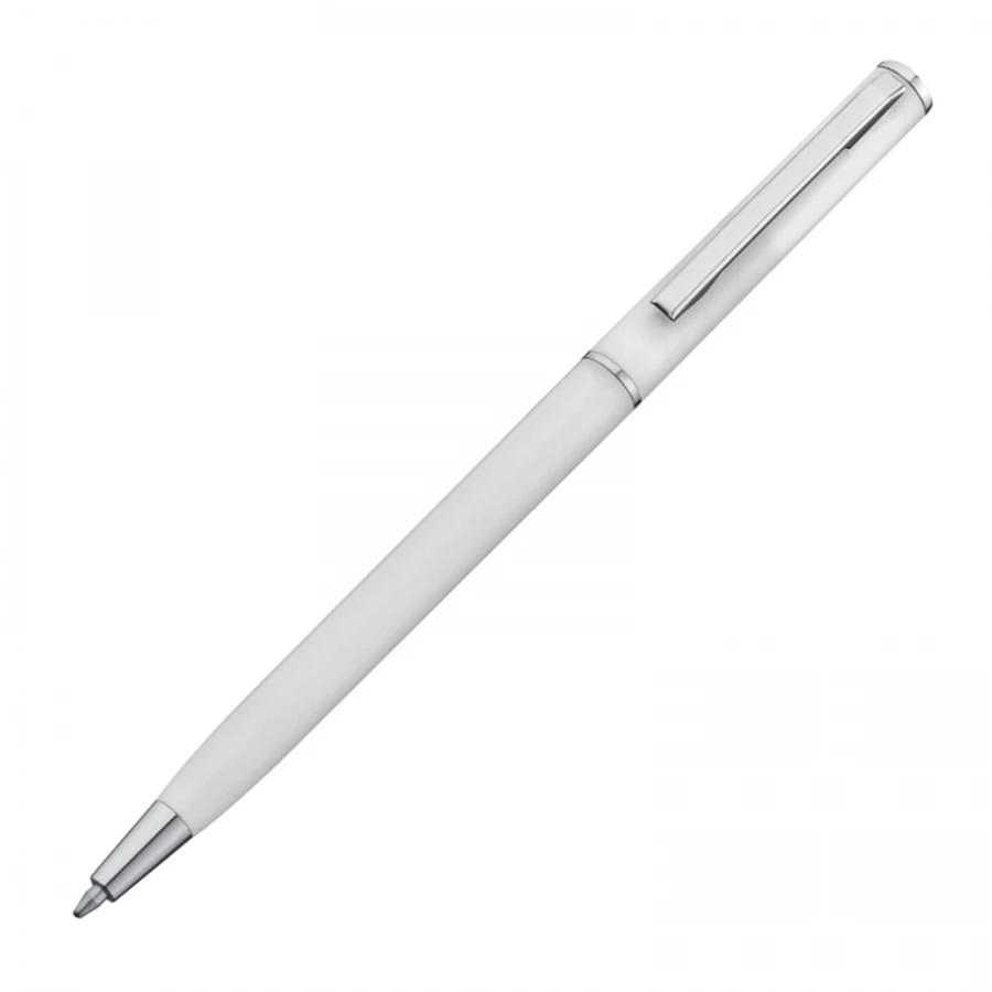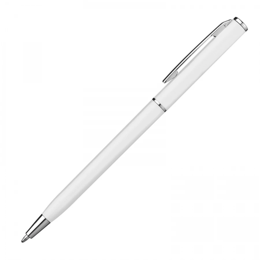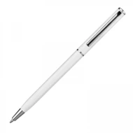 Smukły długopis plastikowy z mechanizmem obrotowym i wkładem piszącym na niebiesko.