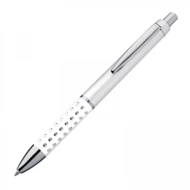 Plastikowy długopis o ozdobnym korpusie, z wkładem piszącym na niebiesko.