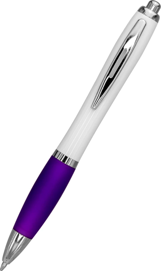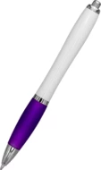 Plastikowy długopis z białym korpusem i kolorową gumką ułatwiającą trzymanie. Wyposażony w metalowy klips i duży wkład piszący na niebiesko. Długopis dostępny w bogatej gamie kolorystycznej.