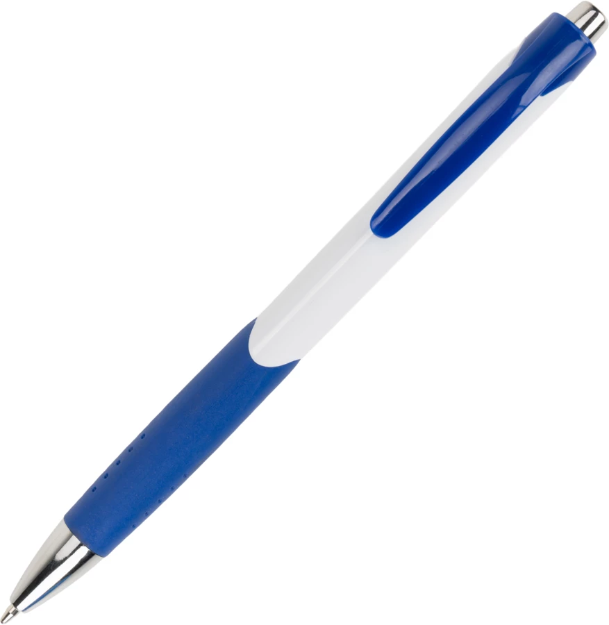 Długopis plastikowy, wyposażony w klips i gumową strefę chwytu oraz niebieski wkład.