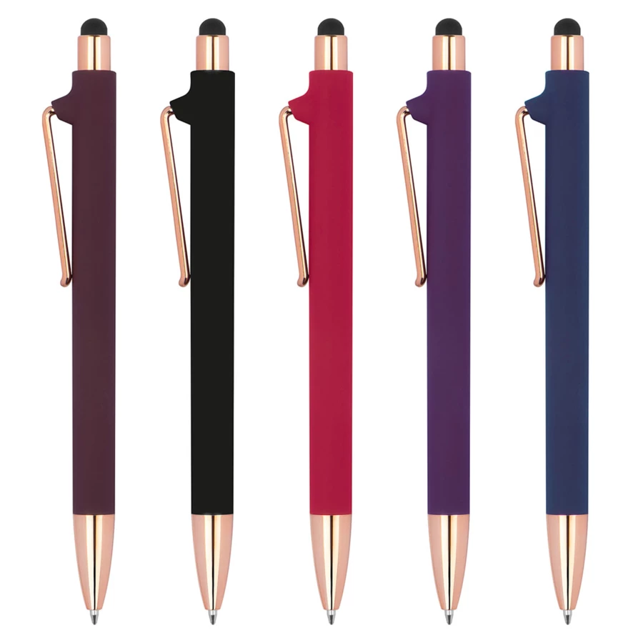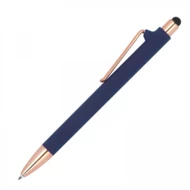 Długopis plastikowy z przyjemną w dotyku, gumową powłoką, niebieskim wkładem oraz elementami w złotym kolorze. Końcówka długopisa posiada również funkcję touch pen.