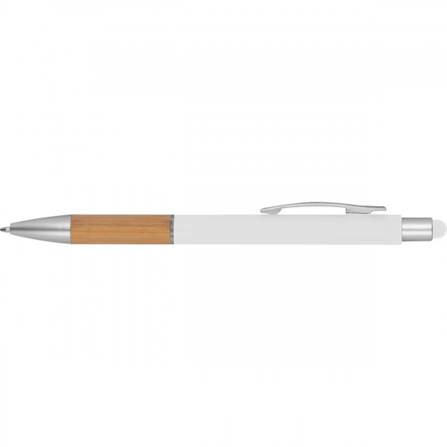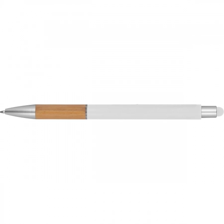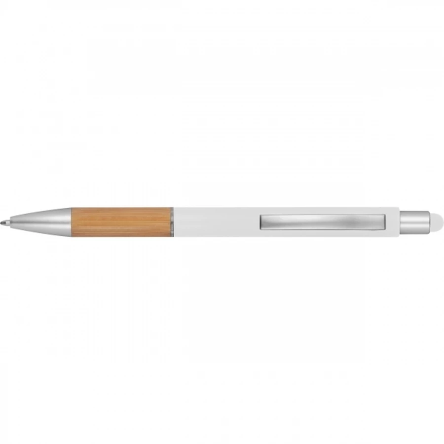 Długopis wykonany z plastiku z bambusową strefą uchwytu, funkcją touch pen do obsługi ekranów dotykowych. Długopis podsiada wkład piszący na niebiesko.
