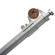 Długopis plastikowy z suwmiarką PRESCOT. Wkład niebieski. Logotyp umieszczany po przeciwnej stronie miarki. Całość z plastiku.