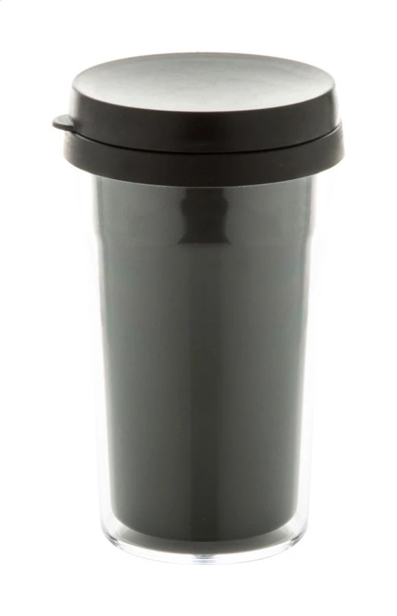 Doppelwandiger Thermobecher aus Kunststoff mit Deckel. Zwischen den beiden Wänden der Tasse kann eine individuelle Grafik platziert werden. Füllmenge: 250 ml. Einzeln in weißer Box.