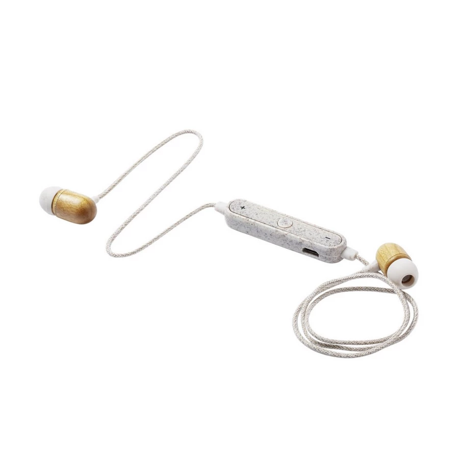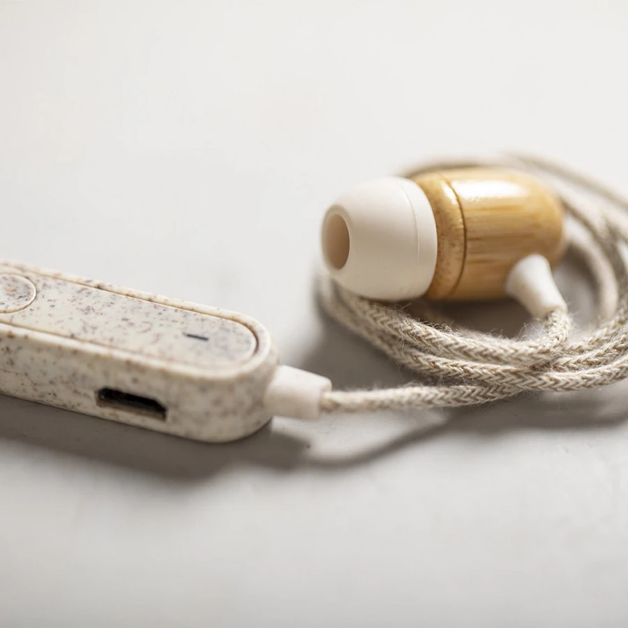 BT 5.0 Funkkopfhörer, In-Ear, Kopfhörer aus Bambus, Einstellpanel aus Weizenstroh, Kabel mit Hanfmaterial ummantelt, Anrufannahmefunktion, Einstellpanel, geladen über USB, Reichweite bis 10 m, Akku 60 mAh, Arbeitszeit: 3h, Micro-USB-Kabel enthalten