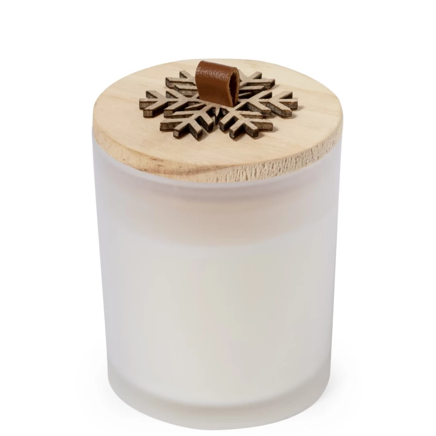 Duftkerze mit Vanillearoma, im Kerzenhalter aus Glas mit Holzdeckel mit Schneeflockenmotiv