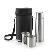 Set bestehend aus Isolierkanne (500 mL) und Tassen aus Edelstahl. Doppelwandige Isolierkanne mit 2 Tassen (je 200 mL) und einer Tasche aus 600D mit verstellbarem Tragegurt. Tasche: 155 x 250 x 90 mm