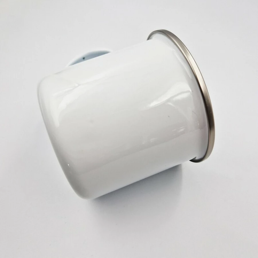 Emaillierter Becher 360 ml für Sublimation. Leichte Unvollkommenheiten deuten auf handgefertigte Tassen hin