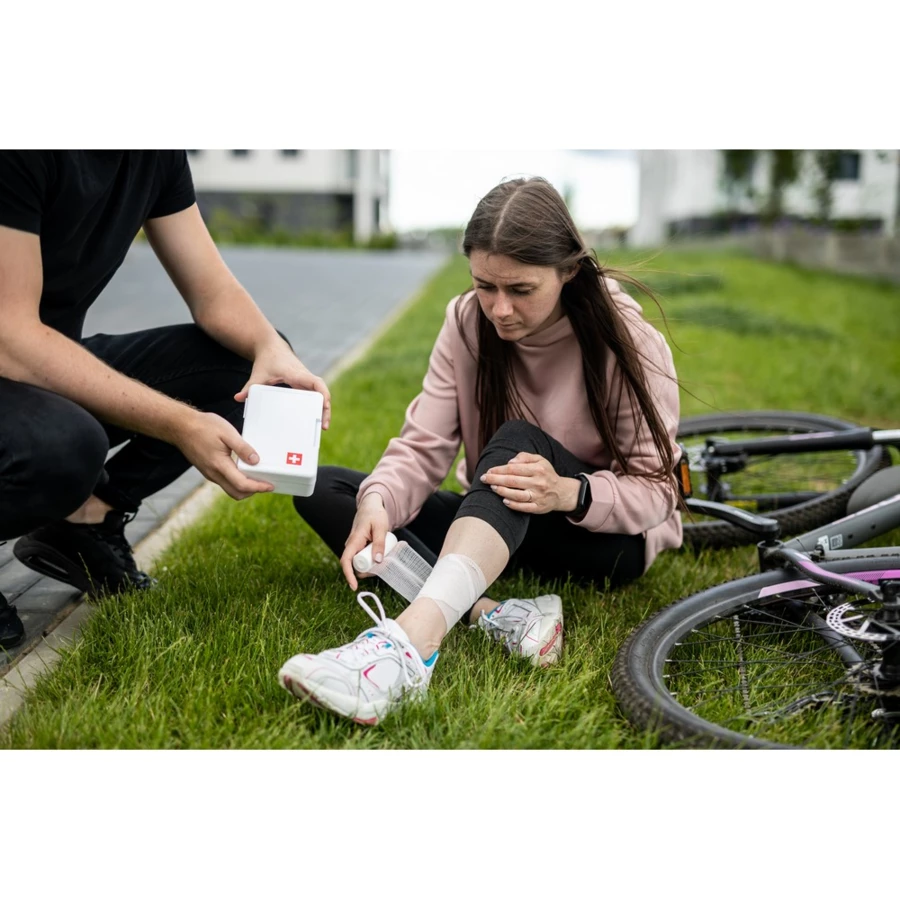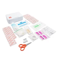 Erste-Hilfe-Set im Kunststoffkoffer, innen: Pflaster 72 x 19 mm (10 Stk.), Pflaster 56 x 19 mm (5 Stk.), Pflaster 40 x 10 mm (5 Stk.), Pflaster Ø22 mm (5 Stk.), flexible Pflaster 76 x 38 mm (2 Stk.), Alkoholtupfer 3 x 6 cm (6 Stk.), nicht haftende Tupfer 5 x 7,5 cm (2 Stk.), Vliesband 1,25 cm x 4,5 m (1 Stk.), PBT-Bandage 7,5 cm x 4 m (1 Stück), Schere (1 Stück), antiseptisches Reinigungstuch 2 x 20 cm (4 Stück), Wattestäbchen (10 Stück/Beutel), Sicherheitsnadeln (10 Stück), Einweghandschuhe (1 Paar), Vlies-Wundverband 5 x 9 cm (1 Stück)