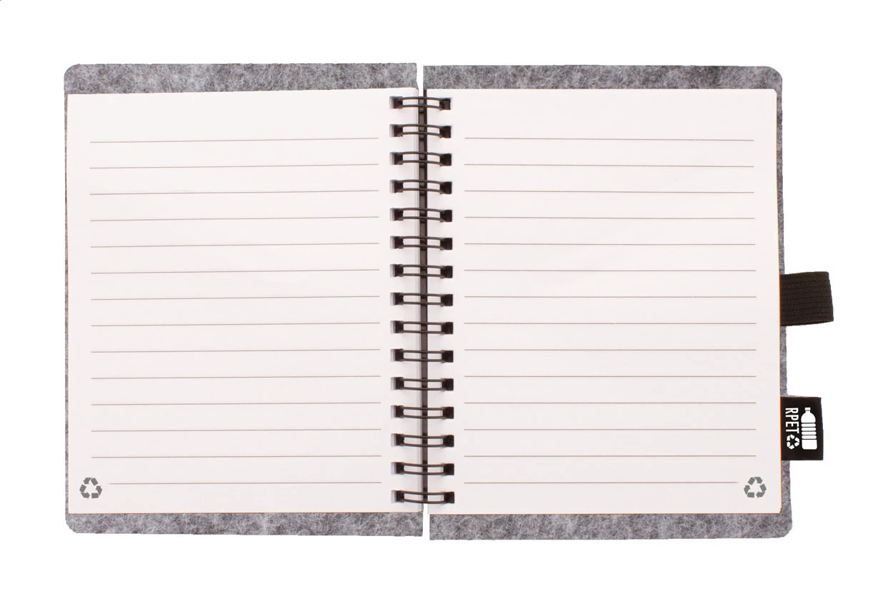 Mit RPET-Filz überzogenes Spiralnotizbuch, RPET-Label und 80 linierten Blättern aus recyceltem Papier. Größe A6.