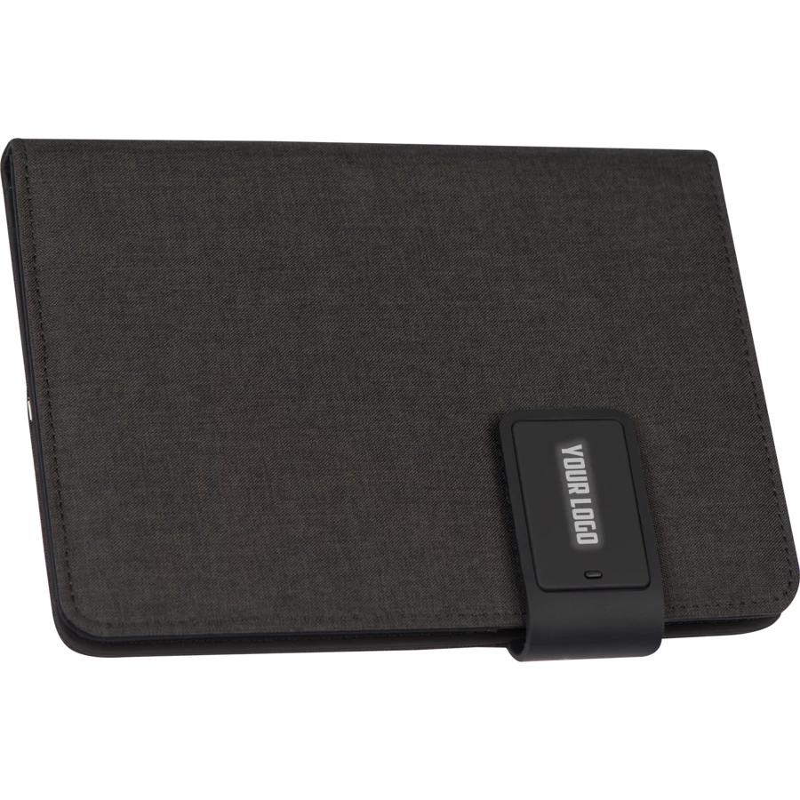 Notatnik formatu A5, z kartkami w linię, z wbudowanym power bankiem o pojemności 4000 mAh, kablem, kieszonkami i miejscem na telefon. Zamykanie magnetyczne, na którym można umieścić logotyp podświetlany lampką LED na dany kolor.