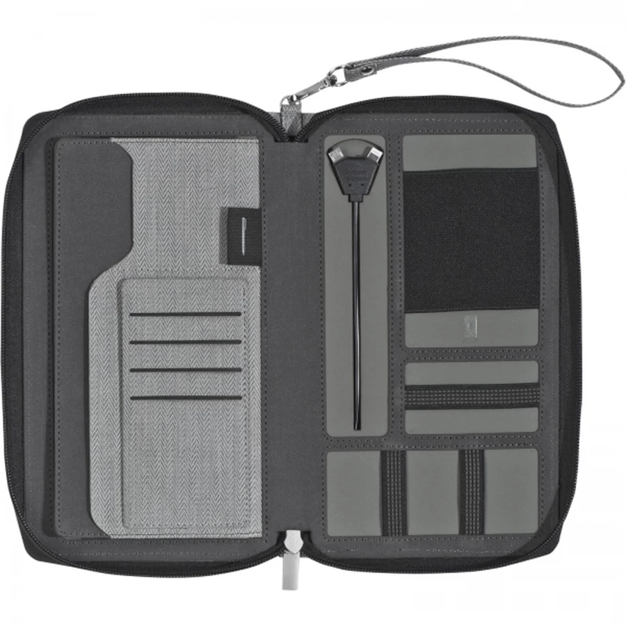 Teczka na dokumenty wykonana z PU i skóry syntetycznej, z power bankiem o pojemności 4000 mAh, kablem USB i licznymi przegródkami. Dane techniczne: Typ baterii: Litowo-polimerowa Pojemność: 4000 mAh Charge input: 1mA, 5V Charge output: 2.1mA, 5V Inne: Kabel posiada złącza USB A i typ C. Kabel do ładowania folderu (zamieszczny pod notesem): 3w1 (lighting, typ C, mikro USB)